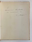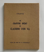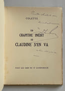 [Clichy, Imprimerie Paul Dupont], Pour les amis du Dr Lucien-Graux, 1937. In-12 carré, broché, couv. rempliée.Édition originale de ce chapitre "Claudine et les contes de fées", recomposé par Colette à partir d'un manuscrit, quelques peu blessé (et fragmentaire) appartenant au collectionneur le Dr Lucien-Graux (1878-1944).Paru en 1903 aux éditions Paul Ollendorf, "Claudine s'en va" est le quatrième tome de la série Claudine.Riche fabricant de produits pharmaceutiques et créateur de la maison de parfums Arys, il réunit une importante collection de livres manuscrits. Le « Prince des bibliophiles » souhaita également créer sa propre maison d’édition de bibliophilie, pour publier à petit nombre des textes inédits. Résistant arrêté par la Gestapo en juin 1944, il fut déporté et mourut à Dachau en octobre.Ce volume est le 13e de la collection "Pour les amis du Dr Lucien-Graux". Il ne fut tiré que 60 exemplaires, celui-ci est un des 20 sur vélin d'Arches.Double envoi autographe signé des auteurs : un envoi de Colette sur une garde : "à Monsieur Chalvet, en souvenir de Colette", et envoi du Dr Lucien-Graux sur le titre : "Pour M. Chalvet, le cordial souvenir du Dr Lucien-Graux, ce livre édité pour ses amis".