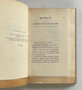 Paris, Arthème Fayard et Cie, 1919. In-12 de 251 pp. ; bradel cartonnage papier fleuri doré, pièce de titre fauve, couv. et dos conservés, à toutes marges, tr. dorées à témoins (Boichot).Édition originale de cette nouvelle relatant l’histoire d’amour d’une jeune artiste du music-hall pour un soldat de passage.Ce ravissant roman reçut un accueil particulièrement touchant de Marcel Proust qui écrivit à Colette : « J’ai un peu pleuré ce soir pour la 1ère fois depuis longtemps, et pourtant depuis q[uel]q[ue] temps je suis accablé de chagrins, de souffrances et d’ennuis. Mais si j’ai pleuré, ce n’est pas de tout cela, c’est en lisant la lettre de Mitsou. Les deux lettres finales, c’est le chef d’œuvre du livre (j’entends de Mitsou car je n’ai pas encore lu En camarades, j’ai de très mauvais yeux, je ne lis pas vite). Peut-être, s’il fallait absolument pour vous montrer que je suis sincère dans mes éloges, vous dire ce que je ne me permettrais pas d’appeler une critique, appliquée à un Maître tel que vous, je trouverais que cette lettre de Mitsou si belle, est aussi un peu trop jolie, qu’il y a parmi tant de naturel admirable et profond, un rien de précieux. » (Lettres à ses pairs).Tirage à 100 exemplaires numérotés seulement. Un des 75 sur vergé pur fil, parfaitement établi par Thomas Boichot.