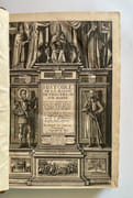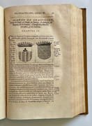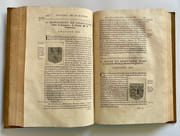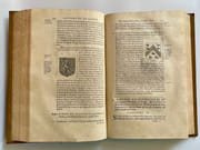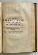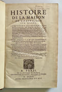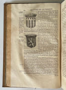 Paris, En la boutique de Nivelle, Sébastien Cramoisy, 1631. 2 parties en un vol. in-folio, I : (18) ff. [titre, titre-frontispice, épître à Gilles de Chastillon, avertissement, épître à André Du Chesne, 3 ff. de table des seigneurs et dames, 6 ff. de tables du contenu, 3 ff. des armes Chastillon, 1 f. de témoignage], 726 pp. (erreurs de pagination à partir de la p. 509, sans manque) ; II : (1) f., 286 pp. ; basane havane racinée, dos à nerfs orné, pièce de titre rouge, tr. mouchetées (Rel. début XXe s).Saffroy III, 38578 : "Livre important et rare".Unique édition, rare, de cette importante généalogie de la maison de Chastillon sur Marne (Nord de la France) de 900 à 1621. Elle est illustrée d'un très beau titre-frontispice par Picart, et de près de 230 blasons gravés sur cuivre in-texte ; la deuxième partie, les "Preuves", contient 10 beaux sceaux médiévaux gravés sur cuivre in-texte.De la bibliothèque de Ferdinand-Ignace Malotau de Villerode (1682-1752), avec son ex-libris manuscrit sur le titre, daté 1708. Chef des magistrats de Valenciennes, il consacra ses travaux (encore inédits) à l'histoire monumentale et héraldique des contrées du Nord.Pâle mouillure angulaire sur un tiers du volume, rares manques marginaux et minuscules trous de vers sans gravité, quelques annotations anciennes.