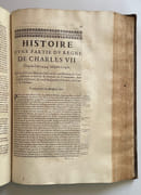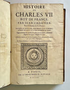 Paris, Imprimerie royale, 1661. In-folio, (14) ff., 907 pp., (10) pp. table ; veau brun, dos à nerfs orné, pièce de titre rouge (Rel. de l'époque).Édition originale collective, réalisée par Denys Godefroy : elle réunit les traités sur Charles VII de Jean Chartier, Mathieu de Coucy, Jacques Le Bouvier, et intègre diverses pièces historiques et mémoires sur les personnages importants de ce règne, dont Dunois, Jeanne d'Arc...Elle est ornée de 5 grands portraits gravés par Grignon : Charles VII en frontispice, puis Jean d'Orléans, Etienne Chevalier, Jacques Coeur et Jean Bureau.Des bibliothèques Abraham Paillot (chanoine à Trente, ex-libris manuscrit sur le titre daté 1718), puis Henri d'Arbois de Jubainville (1827-1910), qui fut directeur des Archives de l'Aube de 1852 à 1880, professeur de langue et littérature celtiques au Collège de France, membre de l'Académie des inscriptions et belles-lettres — avec son ex-libris armorié.Reliure frottée, tachée, coiffe supérieure manquante, petits trous de vers marginaux.
