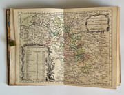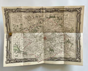 Paris, [Desnos] rue S. Jacques à l'enseigne du Globe, 1762. Petit in-4, titre gravé dépliant en noir, 24 cartes coloriées ; veau marbré, dos à nerfs orné, pièce de titre rouge, tranches rouges (Rel. de l'époque).Édition originale de ce charmant et rare atlas, présentant une carte générale coloriée (25 x 19 cm), Paris et ses environs (2 cartes dépliantes de 41,5 x 31 cm) et les villes de Beauvais, Compiègne, Mantes, Pontoise, Senlis, Dreux, Meaux, Montfort, Coulomiers, Rosoy, Estampes, Melun, Provins, Nemours, Montreau-Fault-Yonne, Sens, Nogent, Joigny, St. Florentin, Tonnere, et Vézelay (21 cartes coloriées de 25 x 19 cm).Louis-Charles Desnos (1725 - 1805), géographe, graveur et éditeur parisien, fut un fournisseur important de la cour de Copenhague ; il fit de sa boutique parisienne "à l'enseigne du Globe", un passage obligé pour la cartographie française, rivalisant avec Sanson, de Fer ou de Robert de Vaugondy.Reliure frottée.