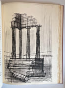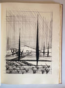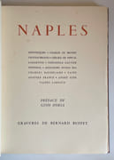 Paris, Compagnie Saint Gobain, 1959. In-folio, maroquin à long grain noir, plats ornés de bandes verticales irrégulières de cuirs noirs brossés dans des sens contraires et trois bandes de cuir travaillé comme une écorce rugueuse teintée en gris et or, dos lisse, doublure bord à bord de box fauve, gardes de daim fauve, couv. et dos conservés, tête dorée, chemise demi-maroquin noir à léger recouvrement doublée de daim gris, étui bordé (A. Butré, 2003).Naples est à l'honneur dans cet ouvrage réunissant 13 textes des XVIIe au XXe siècles : Montesquieu, Chateaubriand, Nerval, Dumas, Baudelaire, France, Gide, Larbaud…L'illustration de Bernard Buffet — 14 pointes sèches originales en noir — saisissent les éléments urbains et naturels, avec son trait expressionniste puissant.Tirage à 300 exemplaires sur vélin d'Arches, celui-ci n° 135 signé par l'artiste au crayon.Élégante reliure d’Annick Butré : ses verticales, jouant du noir et de la lumière, prolongent et fusionnent avec le trait incisif des gravures de Buffet.