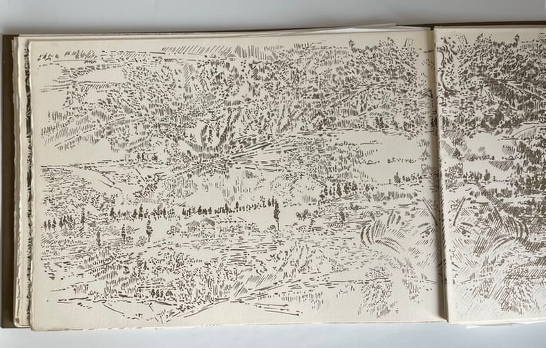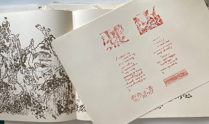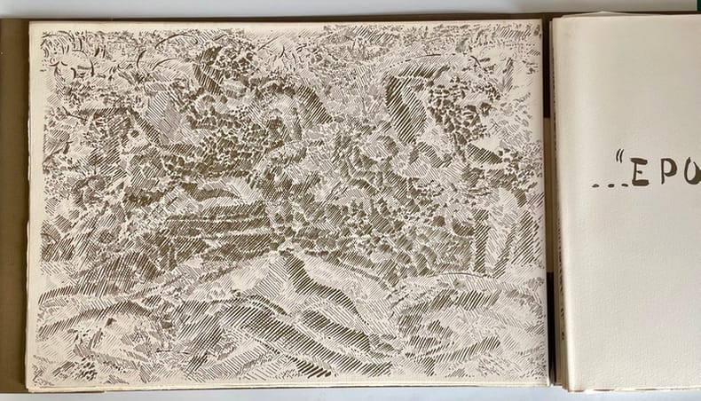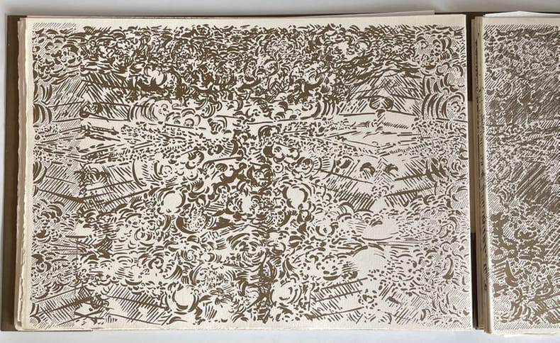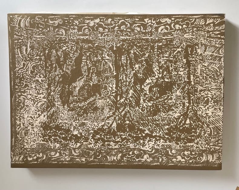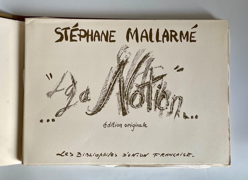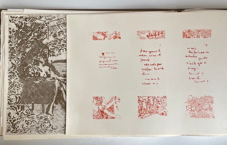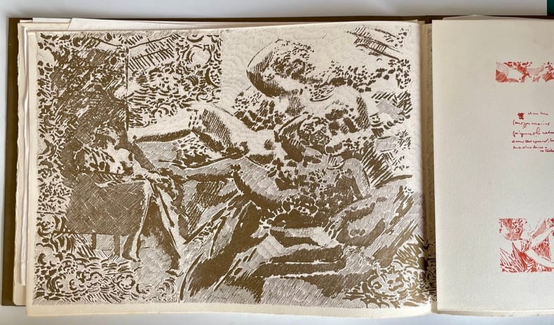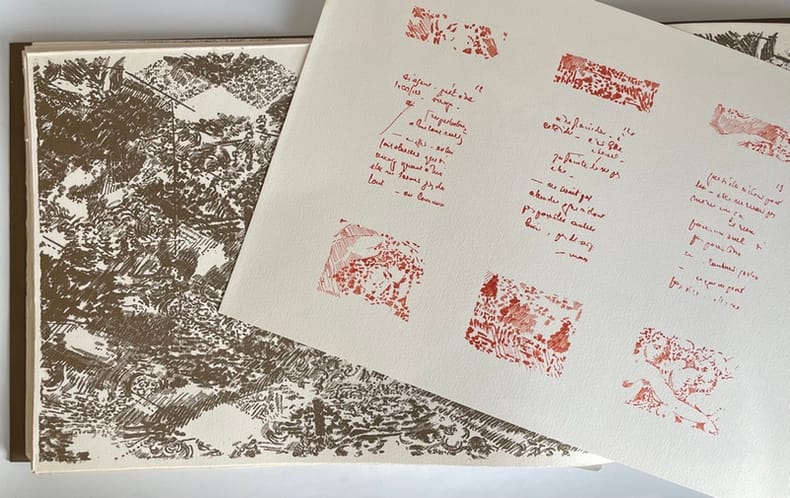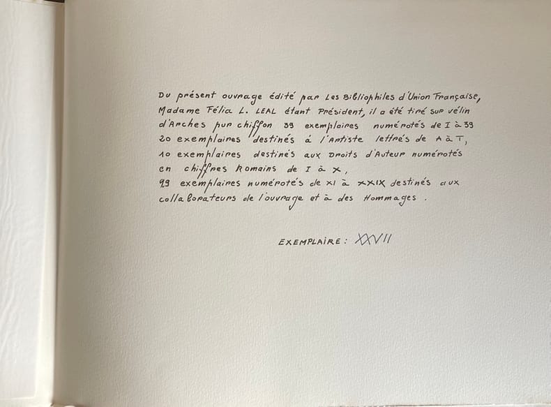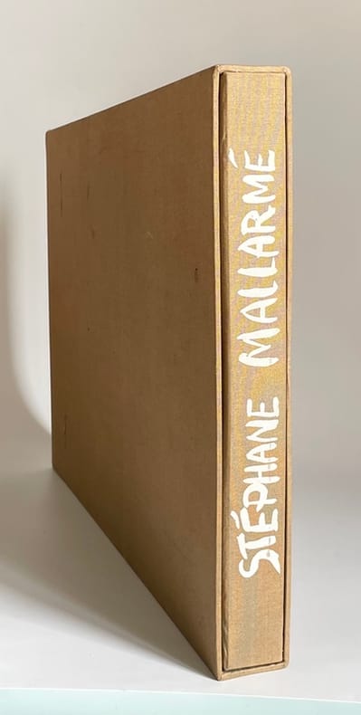 Paris, Les Bibliophiles d'Union française, 1980. In-4 oblong, en feuilles, couverture illustrée, chemise et étui toile havane éditeur.Édition originale rare ; le poème manuscrit original est reproduit en lithographie et accompagné de 24 lithographies originales de François Rouan, en blanc et havane (couverture, vignette de titre et 22 à pleine page). C'est le premier livre illustré par l'artiste, caractéristique de ses travaux de superposition de la figure et de son fond. Né en 1943, François Rouan fut d'abord proche du mouvement Supports/Surfaces. Il explore alors le collage avant de parvenir, dès 1965, à ses premiers tressages, qui deviennent sa signature. À partir des années 1980, il élargit sa pratique en y associant la photographie et le film. "Le cadrage ne change rien : dans mon travail, la dissymétrie éruptive entre ce qu'il est convenu d'appeler "peinture" et ce qu'il est convenu d'appeler "photogra- phie" ou "film" agit des procédures échangistes. Superpositions, nouages des unes et des autres, images fixes et images en mouvement cherchent toujours le même tressement indénouable de la figure et du fond".Tirage unique limité à 88 exemplaires numérotés sur vélin d'Arches. Un des 19 hors commerce destinés aux collaborateurs.Étui frotté. Rousseurs pâles.